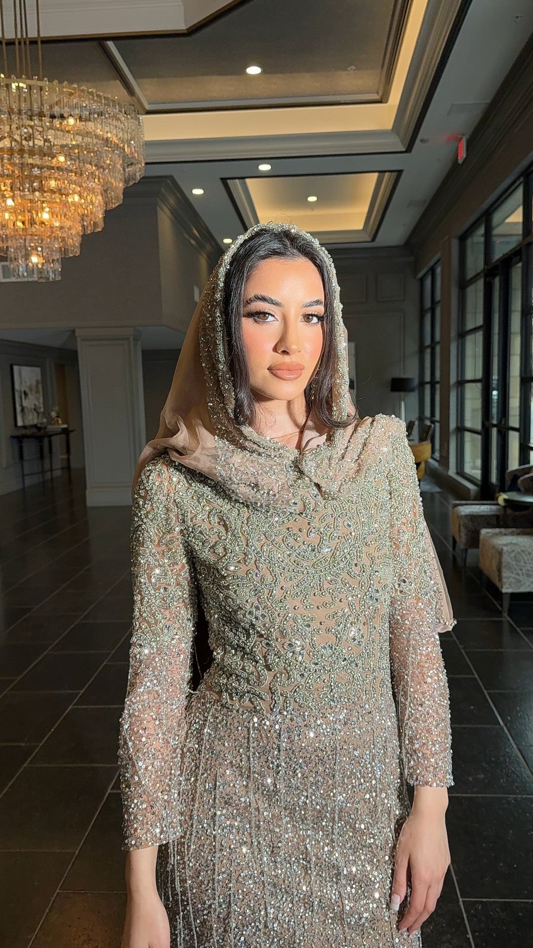 The Aleya embellished headscarf is the perfect accessory to the Aleya Dress, with a lined scarf and beaded trim that will add a touch of elegance and modesty to your look. Make a statement with this high-end and exclusive piece.