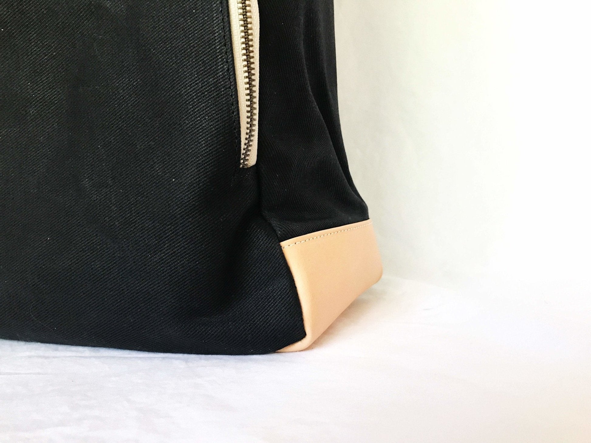 Notebooks & Honey bags are made of 100% cotton18 oz. filter twill. There is a TexWax finish, making it a durable, water-resistant, and weather-tough wax canvas great for everyday uses and adventures. Each tote bag is paired with a 100% nylon lining that is soft yet strong and also water-resistant. The straps are 7-8 oz vegetable tan leather and are paired with a thinner version of vegetable tan leather for the bottoms, zipper tabs, and logo. The wax canvas and vegetable tan leather are meant to have their own unique characters that will show through as the bags weather and patina and over time and use. There is an edginess to the material choices that, paired with the design, give the bag a sophisticated yet down-to-earth look.