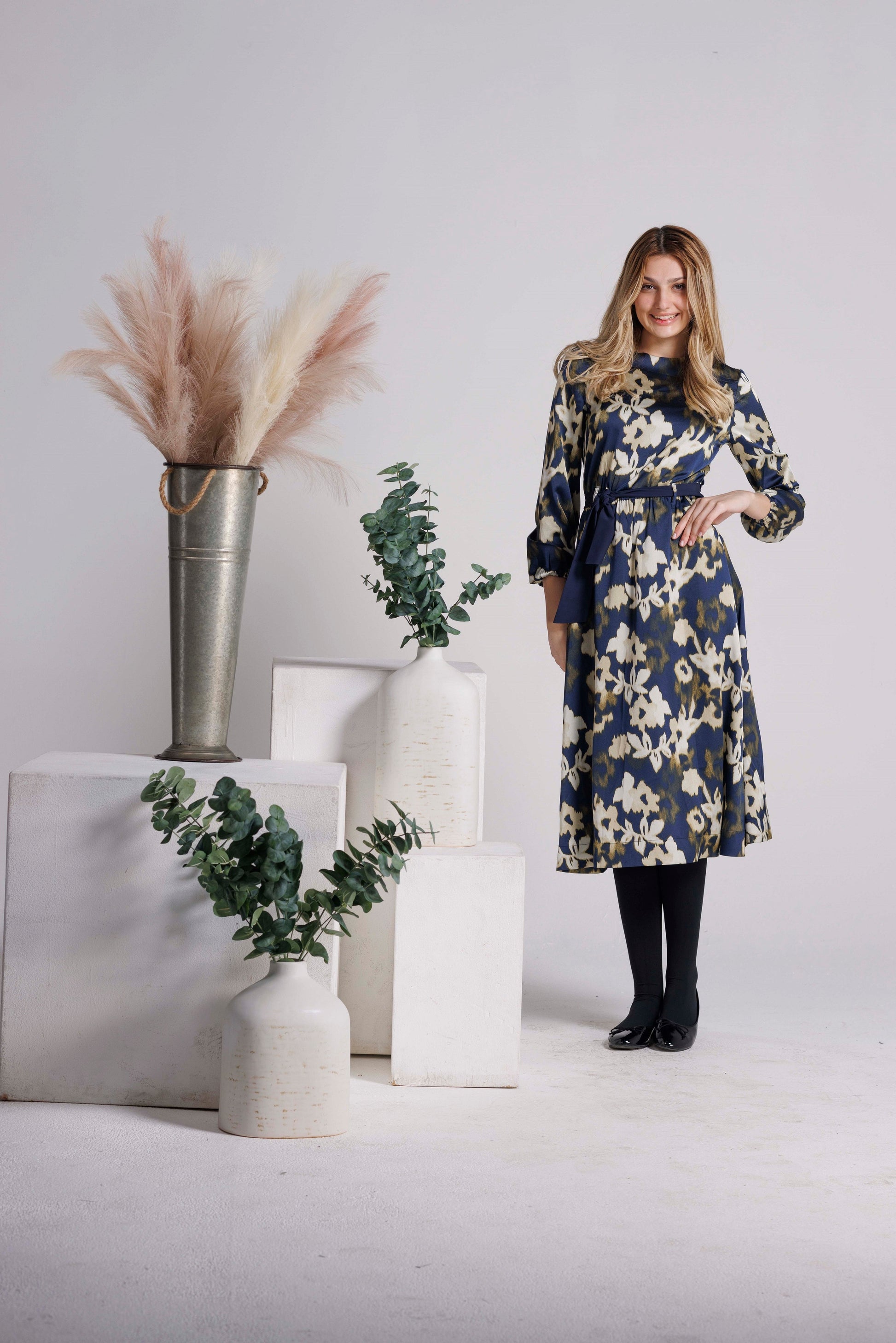 Indulge in luxury with this dress. This exclusive piece boasts a sophisticated navy color and a flattering waisted design. The vibrant floral print adds a touch of elegance, making this dress a perfect choice for any occasion. Elevate your wardrobe and showcase your refined taste with this exquisite dress.