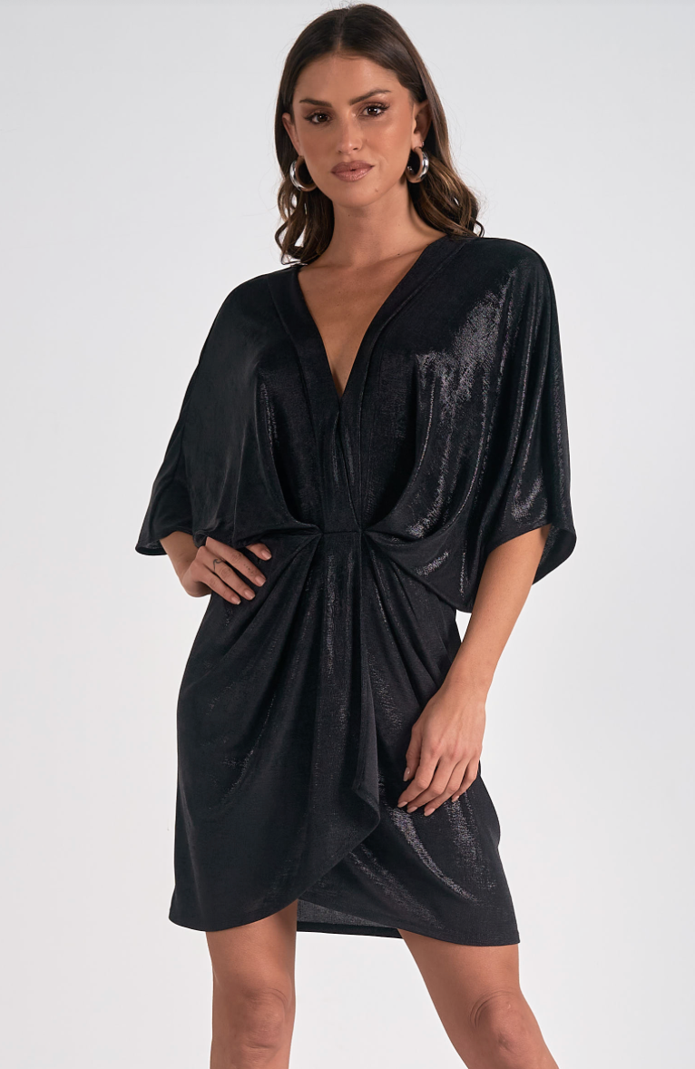 The sophisticated V-neckline is perfectly balanced by the modern dolman sleeves, offering both style and comfort. The highlight of this dress is its twisted, cinched waist, meticulously designed to accentuate your silhouette, making it the ultimate statement piece for any occasion. Crafted from a luxurious metallic, shiny fabric, this dress is perfect for those who love to sparkle and make a lasting impression. Step into the spotlight with confidence and grace in this dazzling creation.