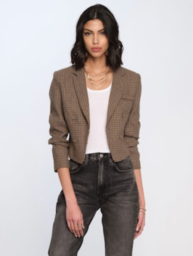 The Lupin Blazer is made from a textured boucle. It's a slim fit and slightly cropped. It features full lining and a jumbo hook & eye as a front closure. For an effortlessly cool look pair it with a white tee and your favorite vintage denim.