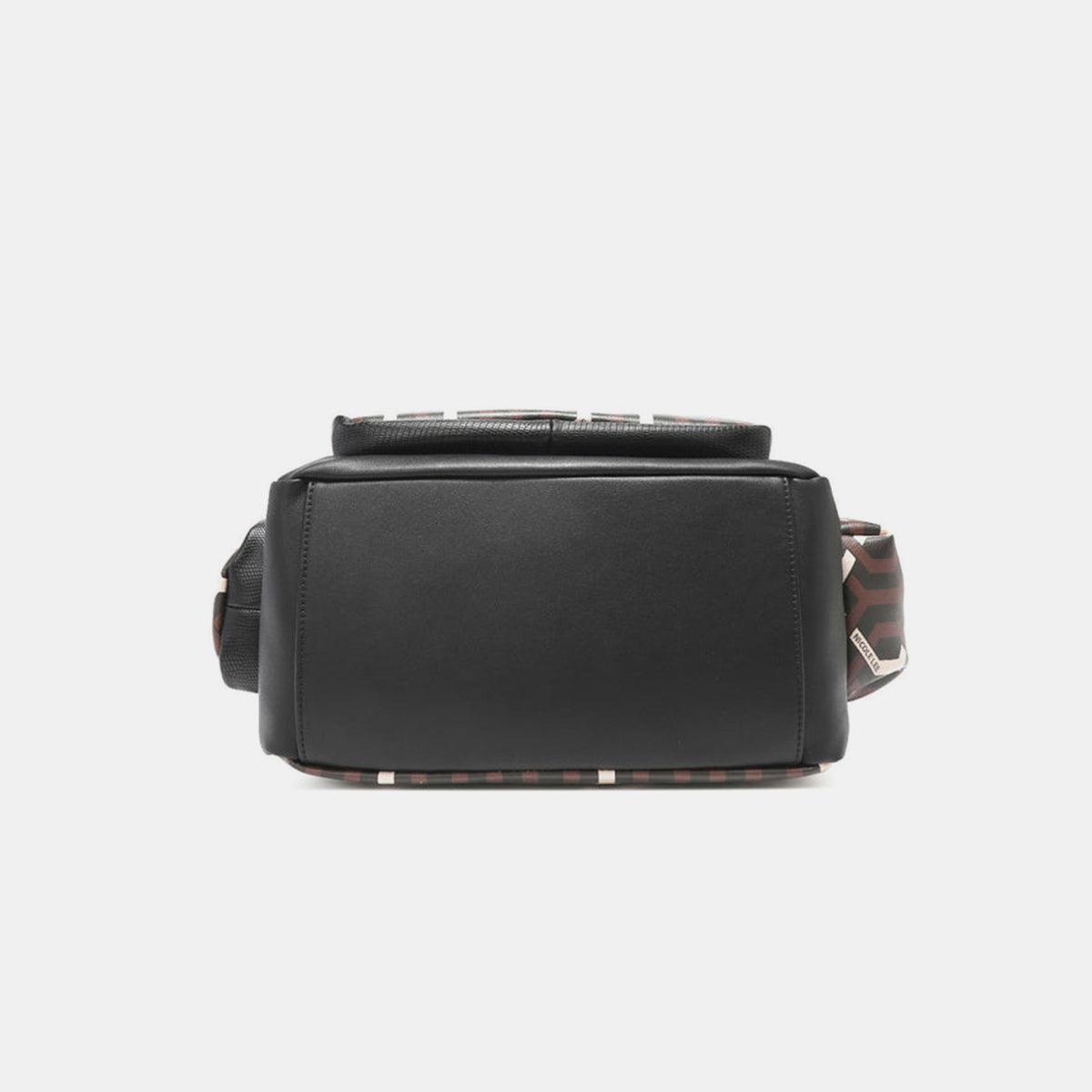 3 front compartments (1 flap compartment with magnetic snap button closure, 2 zip compartments)