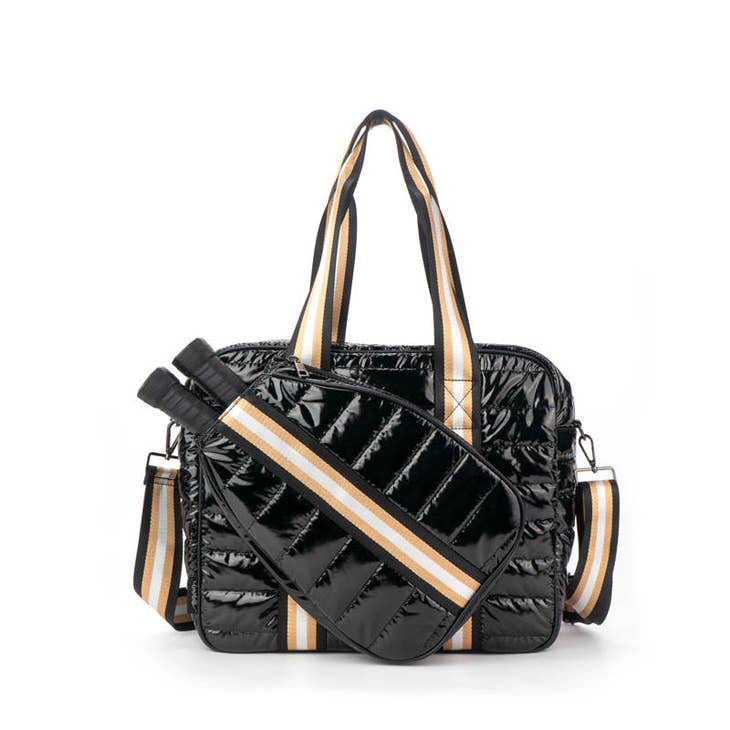 Game. Set. Style! Our new Signature Puffer Pickle ball tote is perfect for all day play. Adjustable, detachable crossbody strap. Tote dimensions 14L x 11W x 5D Racquet Bag Dimensions 12L x 3W x 1.25D