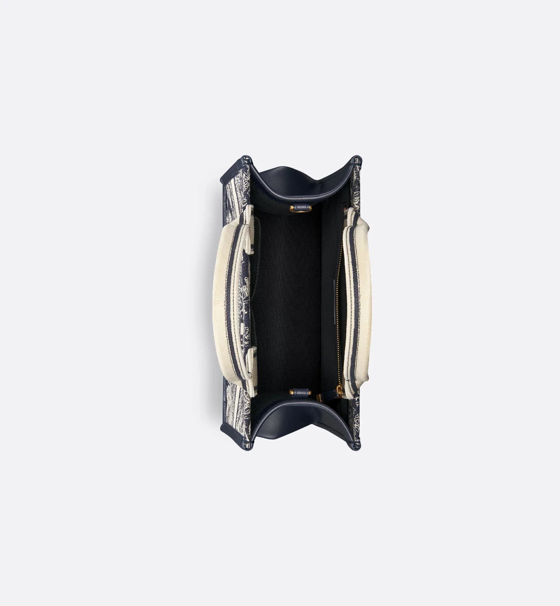 Maria Grazia Chiuri's hallmark Dior Book Tote is offered in an elegant variation. The refined style combines blue calfskin with the iconic blue and ecru Toile de Jouy Reverse embroidery, showcasing the iconic House motif in a play on reversed colors. Designed to keep all the daily essentials organized, the interior is equipped with a zip pocket and slip pockets. Featuring an adjustable and removable shoulder strap, the practical small tote exemplifies Dior's savoir-faire and can be carried by hand or worn over the shoulder.